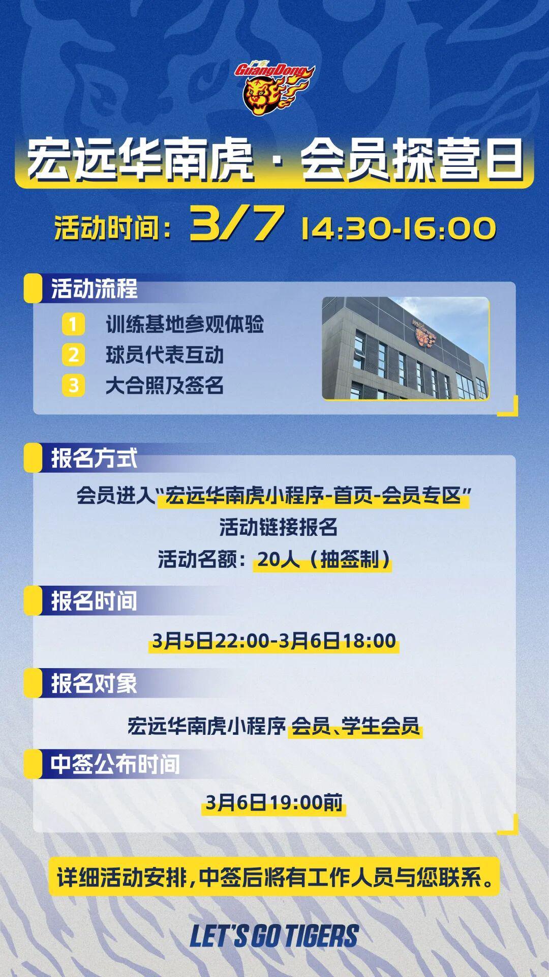 来啦!3月7日(本周六),宏远华南虎首个会员探营日开启!探秘训练基地、深度体验训练日常、与球员代表面对面互动、获得独家福利!